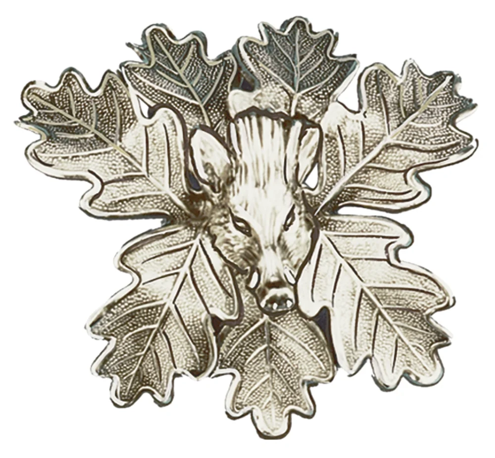 Massives Keilerwaffendeckblatt aus Alpaka versilbert. In der Mitte der sieben Eichenblätter sitz ein Keilerkopf. Die Gesamtgröße beträgt ca. 8 x 8 cm. Das Keilerwaffendeckblatt kann mittig zwischen die Keilerwaffen gesetzt werden. Es deckt die Füllmasse der Gewehre und der Haderer ab.
